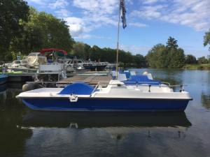 Le pédalo traditionnel en plastique polyester de 2 ou 4 places. Vous êtes assis au ras de l’eau, hauteur idéale pour faire trempette ou carrément le grand plongeon. Une échelle de bain vous permet de remonter facilement à bord. Vous embarquerez facilement votre animal de compagnie sur la grande plage arrière ou profiterez de ce solarium pour prendre des couleurs de vacancier confirmé.